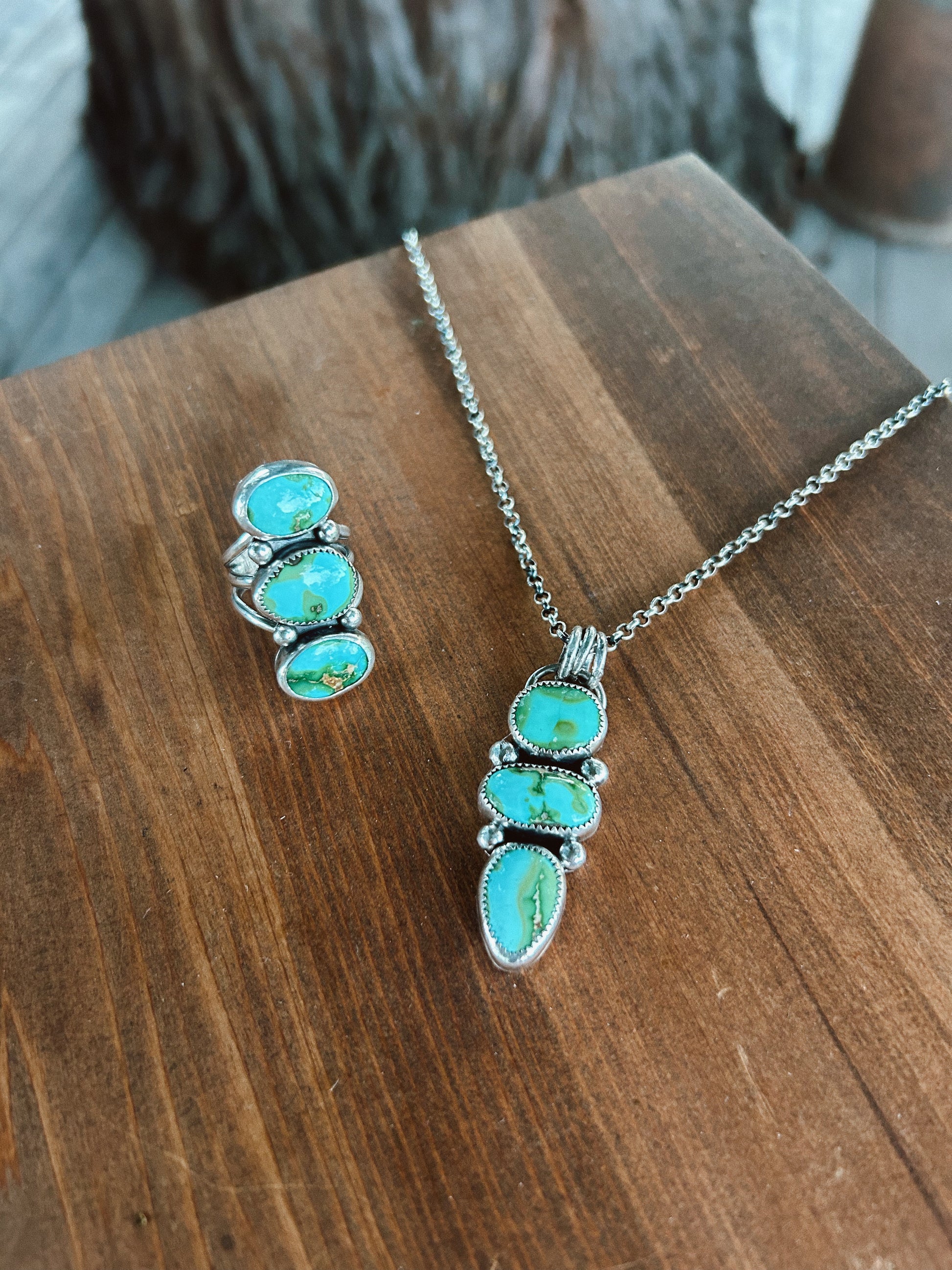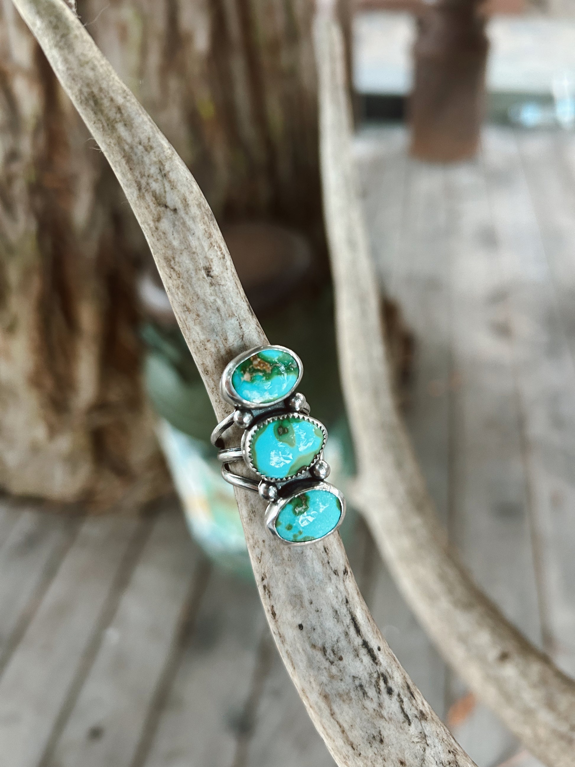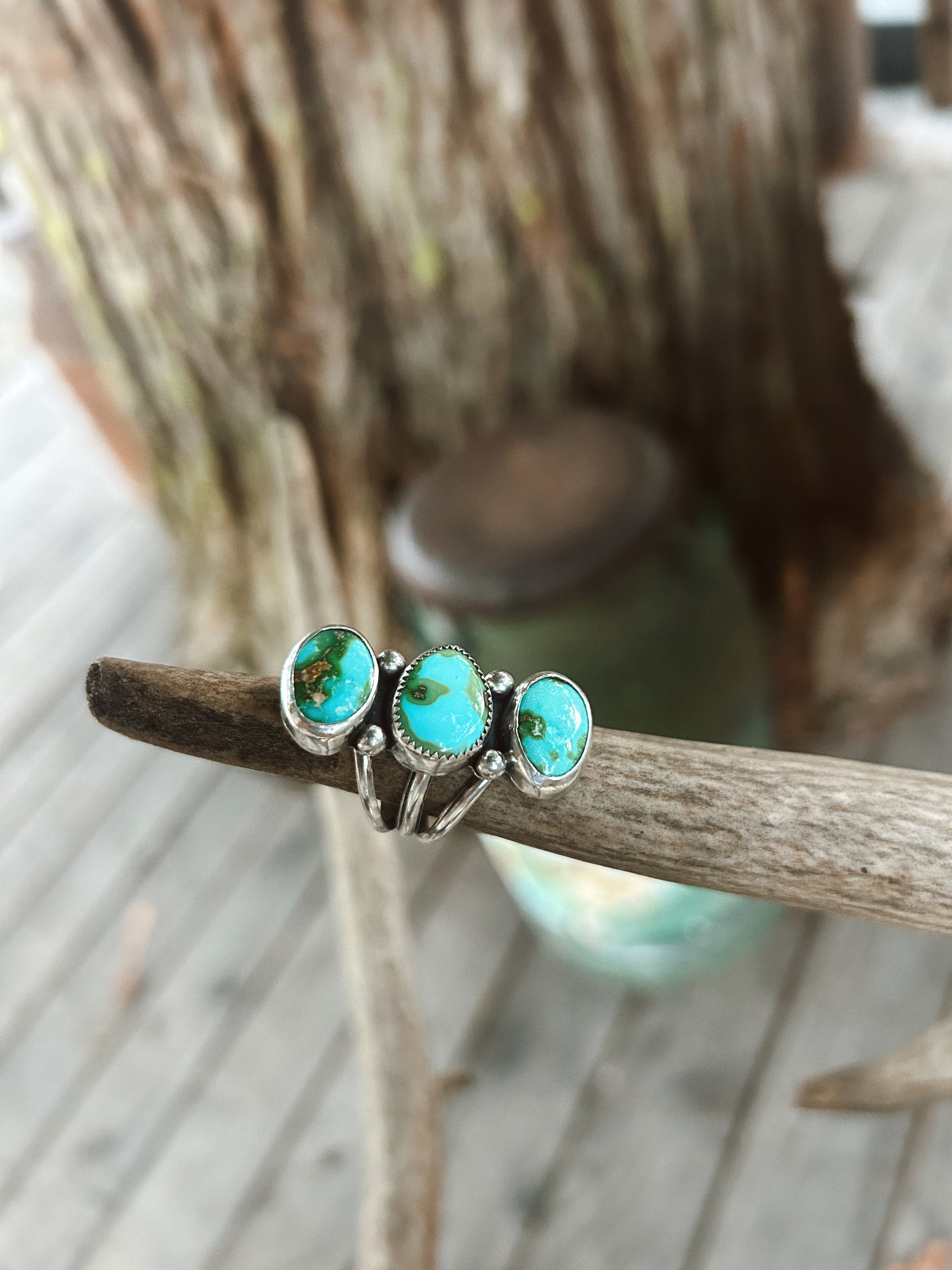 A handmade sterling silver ring with three Sonoran gold turquoise stones