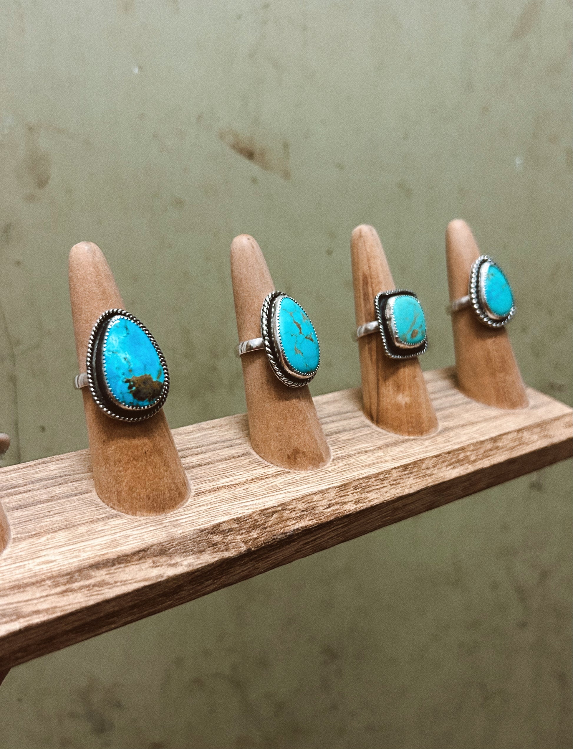 A handmade sterling silver ring with a square turquoise ring and a twisted wire design.